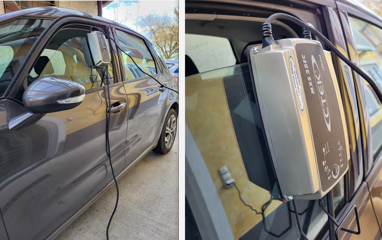 V primeru, da je vozilo oddaljeno od šuko vtičnice za 230VAC, ga priklopimo preko podaljška za 230VAC, obesimo na priprto steklo vozila (nosilec polnilnika ima dodatno zaščito pred poškodbami stekla), steklo vozila ponovno PRIVZDIGNEMO do vrha tako, da NIHČE ne more UKRASTI polnilnika !
