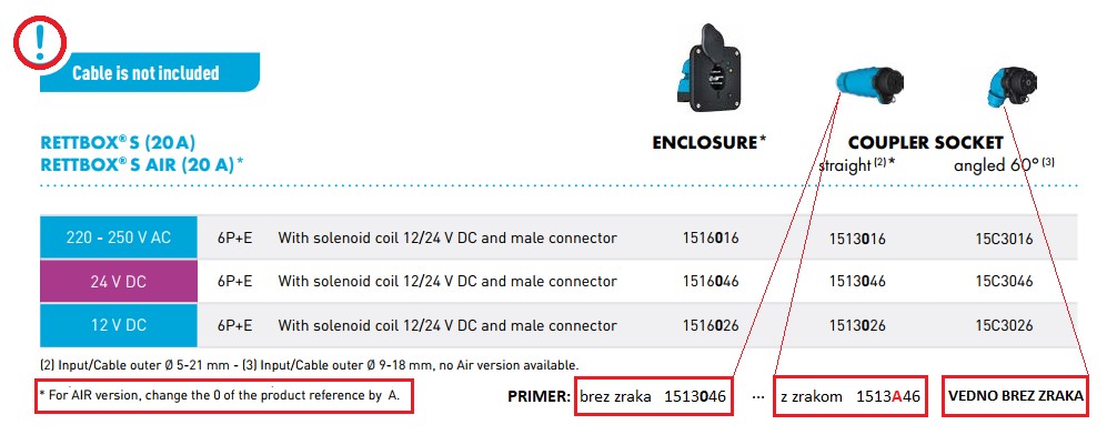 v tem primeru ravnega vtikača, ko je potreba za stisnjen zrak v vozilu, je za ravni vtikač z ZRAKOM potrebno dokupiti Rettbox-S KABEL 611AKOM za dobavo 20A /230V, 12V ali 24V s cevjo za ZRAK