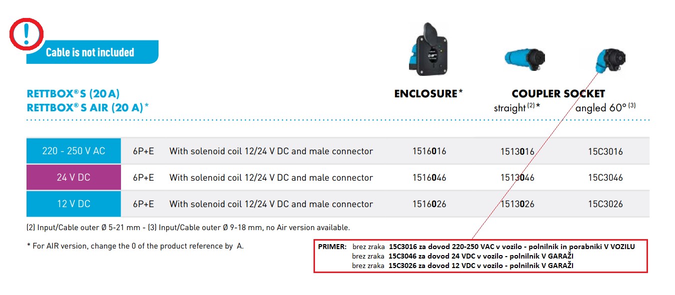 - za dovod 230-250VAC v vozilo je art. 15C3016